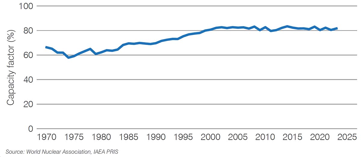 مدتی است در خبرها درباره ساخت نیروگاههای خورشیدی زیاد میخوانم و میشنوم. گویا دولت بر آن تاکید دارد. نیروگاه خورشیدی خوب است، حتی جاهایی لازم است. اما جای نیروگاه هستهای را نمیگیرد. نیروگاه هستهای حداقل 80 درصد از سال پیوسته برق تولید میکند. یعنی اصطلاحا میانگین ظریب ظرفیت نیروگاههای هستهای در دنیا بیشتر از 80 درصد است و با ارتقای فناوری، سال به سال آمارش بهتر هم میشود (نمودار 1).