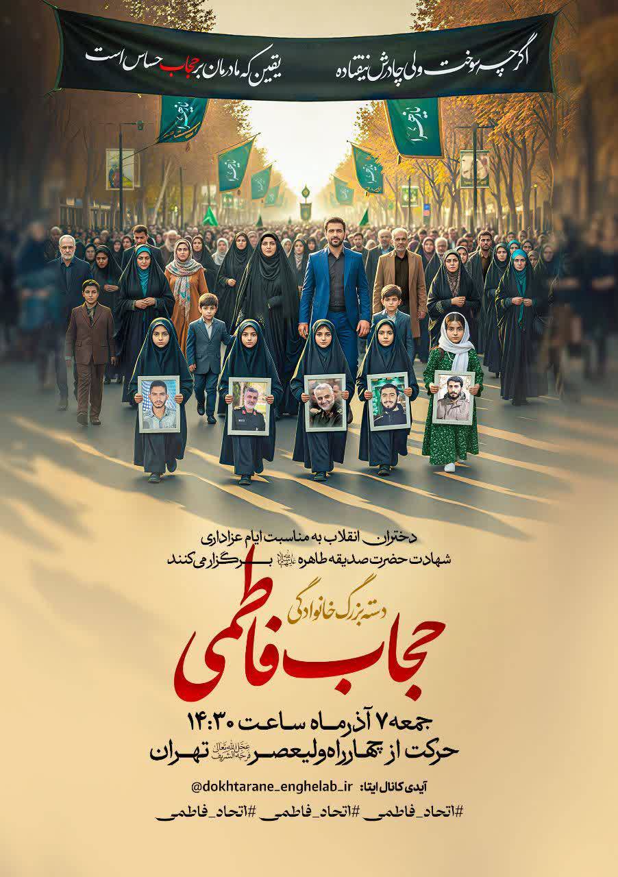 فردا جمعه، هفتم آذر، ساعت دو و نیم بعد از ظهر، مردم تهران در قالب دستهی بزرگ خانوادگی «حجاب فاطمی»، برای تعظیم مقام حضرت زهراء سلام الله علیها و حمایت و حراست از سلامت فرهنگی و حجاب و عفاف جامعه، از چهارراه حضرت ولیعصر عج الله تعالی فرجه الشریف به حرکت درمیآیند.
